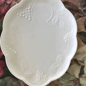 MILK GLASS LUNCHEON PARTY SNACK PLATES SET OF 4. GREAT FOR APPETIZER AND H’ORDERVES, VINTAGE 1950s. Set of 4 cups sold separately in one of my other listings. HARVEST GRAPE AND VINES DESIGN. No chips or cracks. Please ask any questions prior to purchase. Plate 10.125” x 8”. Hall.