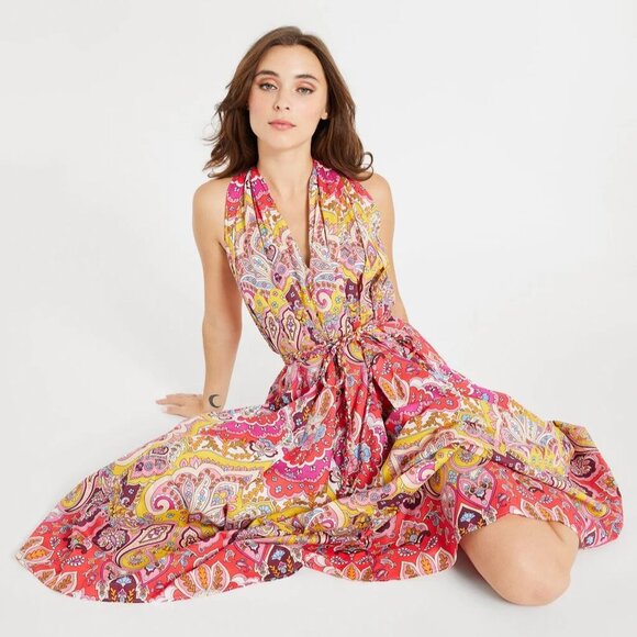 The Marilyn dress is sophisticated and wildly flattering. Halter-style neck with gorgeous full skirt. The wraparound braided rope belt creates a fitted waistline and a stunning drape. Midi length with slash pockets.