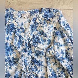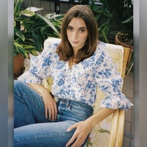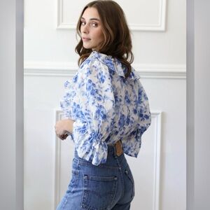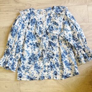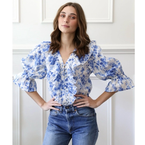 Lightweight blue floral blouse with feminine ruffle trim and V-neck detail. Soft white background with delicate blue floral print. Three-quarter puff sleeves with ruffle cuffs for a romantic silhouette. Easy to style with jeans or skirts for a polished everyday look.