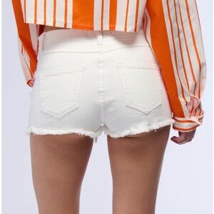 The Front Denim Skort is a slightly stretchy white denim number featuring a layered button-front over skirt, a high rise waist, attached inner shorts, and functional back pockets.