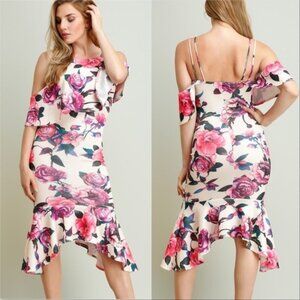 Stunning floral print dress with sexy cold shoulder details, ruffled at hem and neckline and as seen, beautiful bodycon fit.