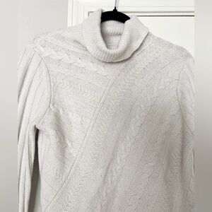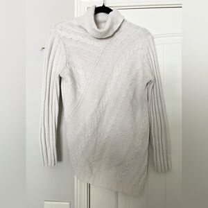 White knit (33% Viscose, 23% Nylon, 20% Cotton, 20% Lambswool, 4% Cashmere). Sweater. Long sleeves. Turtleneck. 23.5" from shoulder to hemline.