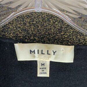 MILLY Black and Gold Merino Wool Cardigan Sweater Features: V-neckline Button front Long sleeves Metallic gold trim Measurements: Size Medium Bust 38" Length 23" back neck to hem All Measurements Are Approximate Item Specifics: Fabric Content 88% Merino Wool/9% Cupro/2% Polyester/1% Metallic Care Dry Clean Condition In Excellent Condition with No Flaws Noted