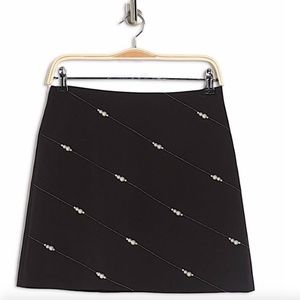 Embroidered pearls line up on diagonal threads for a contemporary take on the classic A-line skirt. 17" length (size 6) Back zip closure Embroidered pearl design A-line silhouette Lined Self: 87% polyester, 13% spandex; Lining 100% polyester; Embellishment: 100% polyester Hand wash cold, lay flat to dry Imported
