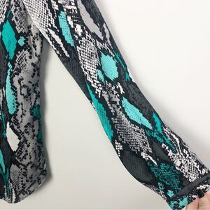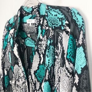 Stunning reptile animal print blouse by Milly. Silk blend. Long sleeves with button cuff. Hook and eye closure at the top 1/4 of the shirt. Teal, black, and silver grey snake print. Great condition! Womens size 4.