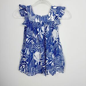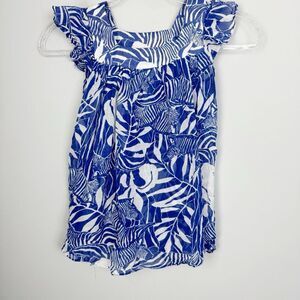 Adorable semi sheer tunic by Milly Minis. Blue and white zebra graphic print (with actual zebras). Flutter style ruffle cap sleeves. Lightweight. Great preowned condition. Kids size 6-7.