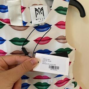 Size 2. Charming Milly dress with a playful lip print. Features vibrant colors for a fun look. NWT! Originally $255! Reasonable offers welcome!