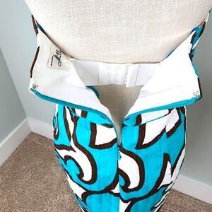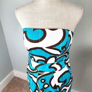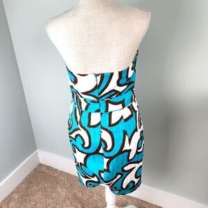 Milly of NY women's dress. Size 6. Strapless. Built in adjustable bra. Side pockets. Back zipper. Lined. Teal brown and white. 100% cotton. Lining 100% cotton. Like new. No tears or stains. Beautiful dress!