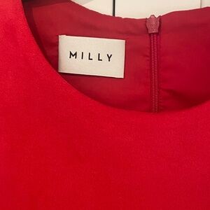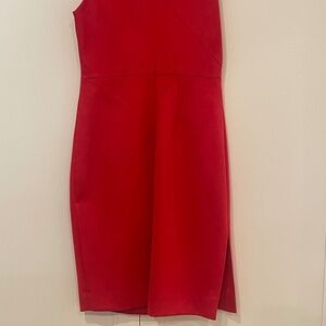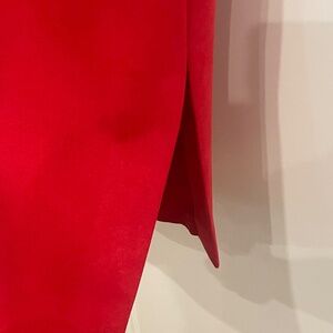 Red Suede (like material), Midi, Fully Lined, Back Zipper, Side slit, Size 8 but on the smaller side.