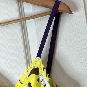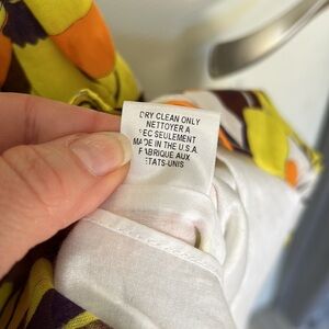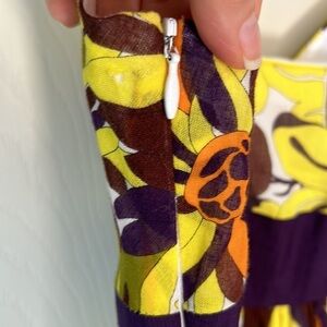 Beautiful sundress, vibrant floral print (orange, white, brown, purple, yellow) with contrast purple silk Empire waistband and spaghetti straps, cotton shell and lining, side zip with hook-and-eye closure, V-neck, mini length, dry clean only.