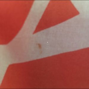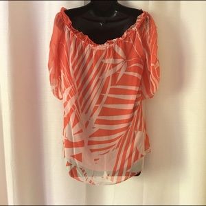 Peachy coral (looks orange in some photos, has more pink/peach in person) with white tropical leaf print. Double layered semi-sheer, 100% silk! Key hole tie (adjustable to sit atop, off, or on shoulders) ballet tie ruched kimono sleeve. Little longer in the back for a flattering fit. Minor spot on lower right front--may come out with cleaning, though it doesn't affect wearability either way. Classic yet on trend. Great paired with nearly every color! Runs a bit big.