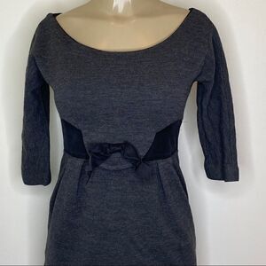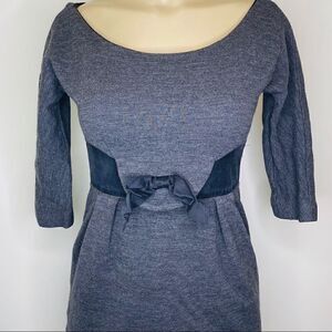 Grey Waist Bow Dress Body 98% Wool 2% Nylon Combo 100% Silk Made in the USA Concealed back zip Scoop neck 3/4 Sleeves Black waist bow. Measurements are flat and approximate. Smoke free home