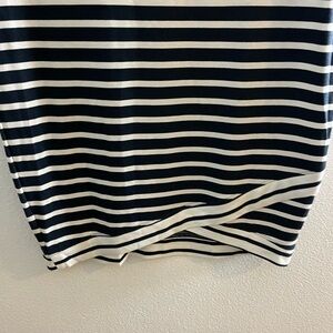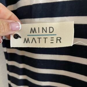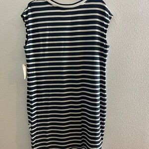This navy and white striped dress by Mind Matter features a shift dress overlay design with cap sleeves. Made with a blend of polyester, spandex, and rayon, this knee-length dress has a crew neck and is a size large. Perfect for travel or casual occasions, this versatile piece can be styled as a tank dress, shirt dress, t-shirt dress, or sundress, adding a touch of chic simplicity to your wardrobe.