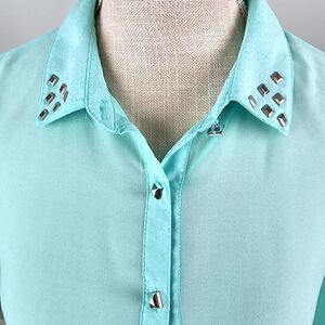 Mine women's button down shirt. Size small. Sheer. Lightweight. Silver embellished buttons. Open back. Long sleeve. 100% polyester. Great shirt for spring and summer! Like new. No tears or stains.