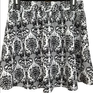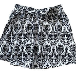 MINE skater style skirt with elastic waistband, size M, gray/ black design. Polyester spandex blend, gray background with black designs. Approximate measurements are waist flat 14”, length from waist approximately 16”.
