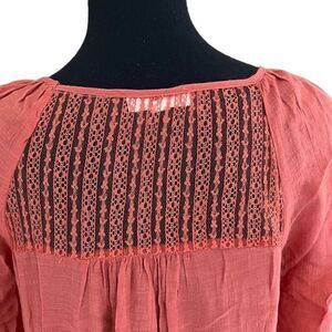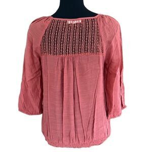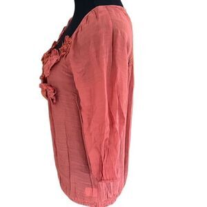 mine embellished bodice 3/4 sleeved top size S. Color is a deep shrimp. Scoop neck, embellished with fabric flowers. Lace back shoulders, elastic at cuffs. Elastic at bottom hem. Rayon and nylon blend. Approximate measurements are pit to pit 17”, length from shoulder approximately 25”.