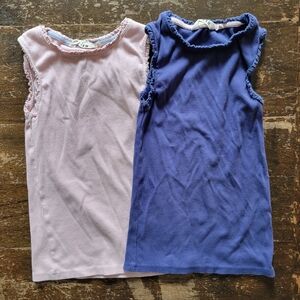 Mini Boden Sleeveless tops in size 11-12Y. One is navy and the other is light pink. Ruffle detail at neckline and on shoulders.