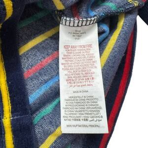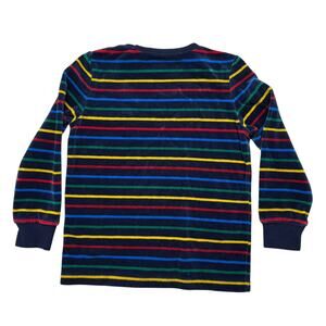 MINI BODEN Velour Rainbow Stripe Long Sleeve Tee. Size 6-7 Years. Blue background with rainbow stripes. Soft and snuggly for cooler months. Left chest pocket. Cotton-polyester blend. Style #B2112. Excellent condition — no rips, stains, or holes. Retail: $48.