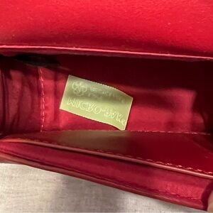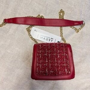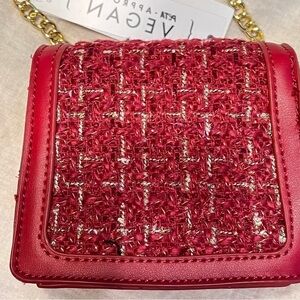 Super cute red mini vegan leather crossbody with gold chain strap.