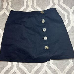 Button front short mini skirt. Black with faux wood buttons on side. Woven material, size M
