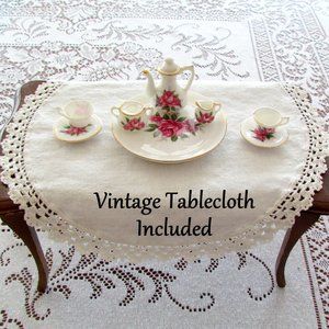 MINI TEA SET, VINTAGE CHINA TEA for TWO DOLLS, GOLD RIMS, By LU PAO + TABLECLOTH