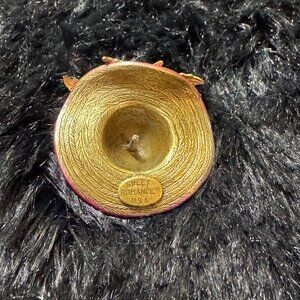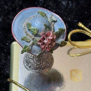 This miniature hat on an ornately designed stand features intricate floral detailing, making it an elegant decorative piece for collectors or gift-giving.
