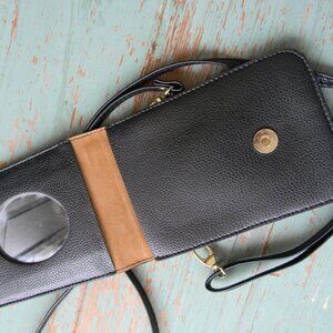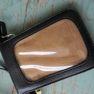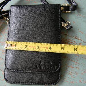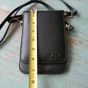 MINICAT BLACK FLAP CROSSBODY CELL PHONE HOLDER MIRROR BAG, GOOD USED CONDITION. SNAP CLOSURE, BACK HAS A CLEAR POCKET FOR A CELL PHONE, MIRROR ON INSIDE.