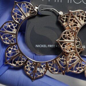 MINICCI rose gold-tone 2-in hoop filigree design drop earrings. These stunning women's earrings feature a rose gold tone with an intricate filigree design, adding a touch of elegance and sophistication to any outfit. These drop earrings are Perfect for everyday wear or special occasions, a versatile addition to your jewelry collection. NWT