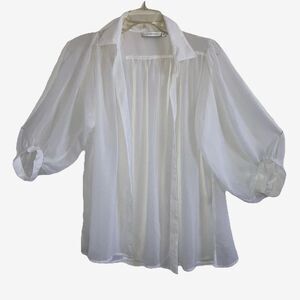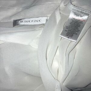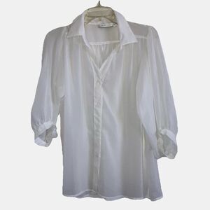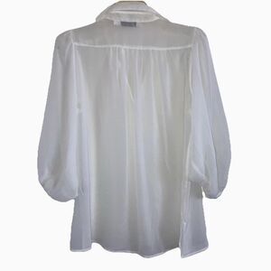 MINKPINK Solid White Ethereal Sheer Chiffon Button down the front Top - Versatile can be worn as a blouse or a cardgian cover up; Collared Neckline; 3/4 Puff Sleeves; Gathered at the front & back yoke for flowy relaxed fit. Side Seam Slits; Minor snag on sleeve, yet doesn't detract from the overall fabulous look. In good condition and is Fresh & Clean and Ready-to-Wear - Has been hand laundered in Ecos non-scented soap and hung dry just prior to listing. Size M - Bust-47" / Waist-49" / Length-27"