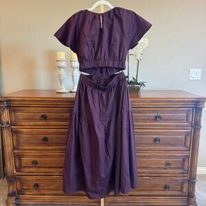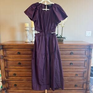 MINKPINK Allegra dress, deep purple cutout midi, flutter sleeve midi dress, tiered cotton dress, NWT designer midi, MINKPINK size M, rare color midi dress