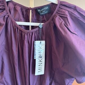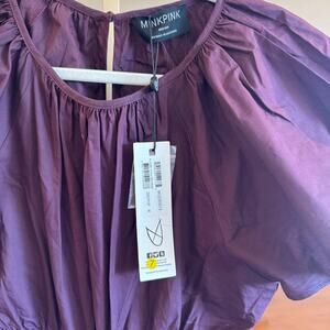 Elevate your wardrobe with the sold-out MINKPINK Allegra Cutout Midi Dress in Deep Purple. Crafted from 100% cotton, this chic midi features a round gathered neckline, flared cap sleeves, and tiered flared skirt. The elasticated waist with side and back cutouts flatters the figure while side-seam pockets add functionality. Finished with a keyhole back and button closure. Hand wash cold. Brand new with tags, never worn. Size Medium. Product Code: 216428032.