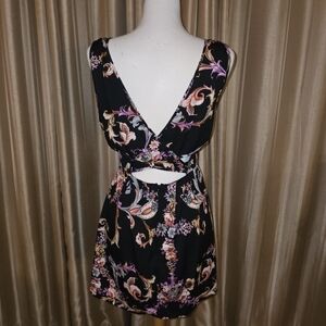 This sleeveless mini dress by MINKPINK features a scoop neckline and a flared skirt, perfect for a casual night out. The black base is adorned with a soft pink floral pattern, offering a romantic and feminine touch. Criss cross back and rear zipper. Chest measures approximately 18". Waist to hem measures approximately 16". 97% Polyester 3% Elastane.