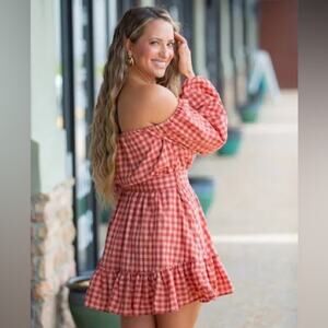 Featuring elasticated puff sleeves, a ruffled hem, and a matching self-covered belt, in a gorgeous blush and rust gingham.- Off-the-shoulder- Puff sleeves- Ruffle hem detail- Self matching belt- Elasticated waist- Fully lined- Mini length- Designed in Australia
