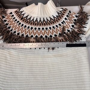 Cozy, chunky, knit with fringe detail and mock turtleneck. Relaxed, slightly oversized, fit. Longer sleeves for an even more relaxed look and feel when they are pushed up. Excellent condition.