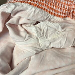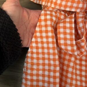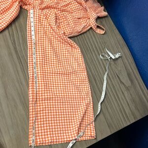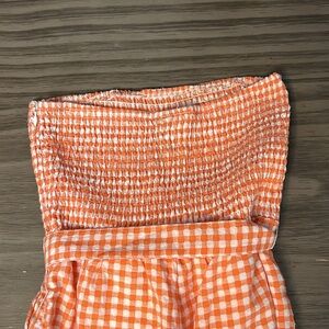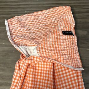 MINKPINK brand, orange, and white checked strapless jumpsuit with pockets, fully lined zip side belted. One strap side belt broken needs repair. Some very minor balling throughout, not noticeable when wearing. Overall good used condition. Please look at all pictures and measurements and comment below with any questions.