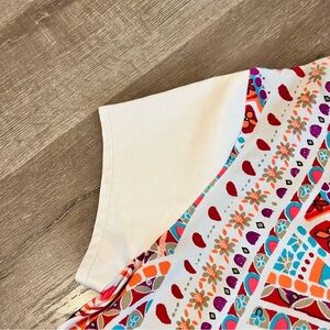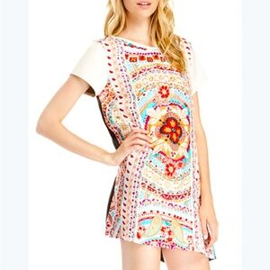 Add a pop of color to your wardrobe with this MINKPINK KOMBI LOVE TUNIC TEE in a vibrant multicolor pattern. The short sleeve shirt dress features a crew neckline and pullover closure, making it perfect for a variety of occasions such as travel, party/cocktail events, or casual wear. The faux leather sleeves add a touch of edge to the bohemian theme, with a relaxed silhouette that flatters any body type. Ideal for all seasons, this dress is a must-have in any fashion-forward woman's wardrobe.