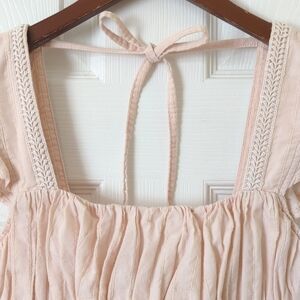 This super cute babydoll top features flutter cap sleeves, a square neckline with an embroidered trim, a ruched bust, a tie across the upper back, a smocked back, and a cropped length. It is composed of a textured cotton that is baby pink in color. It's very lightweight, breathable, and comfortable with a slim fit. Perfect for Spring and Summer! Very versatile, dainty, and simple! Has a complete bohemian boho chic cottagecore vibe! High quality!