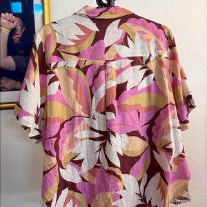 Stylish shirt and shorts set with a bold pink and brown pattern. Perfect for a chic look. Linen set, button down short sleeve shirt, relaxed fit. Shorts have elastic waist with zipper. Pockets. Relaxed fit.
