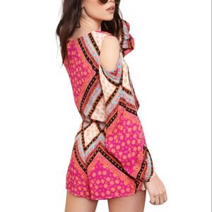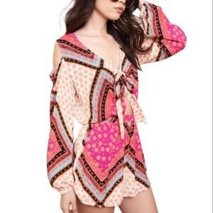 MINKPINK Trance African Geometric Print Playsuit Romper Shorts. Multicolored scarf print, plunging neckline with tie at chest, cold shoulder design, elastic at sleeves& waist. Lined. Has two side pockets. 100% viscose.