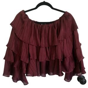 MINKPINK Blouse - Burgundy tiered ruffles, off the shoulder, shimmery vertical pinstripes, long tiered ruffle sleeves, elastic neckline. Very good condition, smoke free home.
