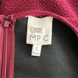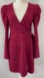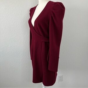 Textured puff sleeve dress from MINKPINK. Burgundy crepe material, hourglass silhouette, long sleeves, deep v-neckline. Hidden back zipper closure. Structured puff sleeves. Small leg slit. Faux wrap front with tie at waist. Beautiful dress with an edge!