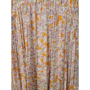 Pink, orange, lilac and white dainty floral print has center front split and flowy feminine silhouette.