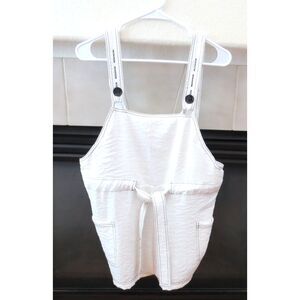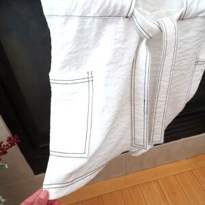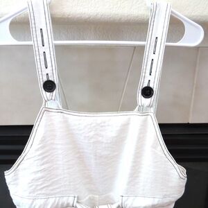 Cute romper with contrasting black stitching and black buttons. 3 button holes on adjustable straps. Tie belt. Pockets. Has a linen-like feel. 47% viscose 36% polyester 17% nylon, machine wash/hang dry. Approx measurements laid flat: length at longest 29.5" waist straight across 19" inseam 2". No signs of wear.