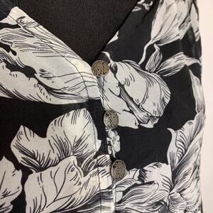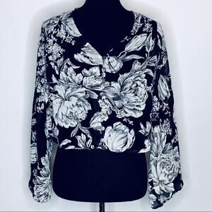 MINKPINK black and white floral sheer cropped top. V neck with button front. Flowy sleeves. Sheer material. Pleating at shoulders. Size M. Excellent preowned conditon. One tiny spot at shown. 100% polyester.