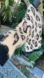 this fun sweater has plenty of a peach colored fuzz to it. That deeper rose leopard print spots are more of a flat knit. Trimmed in black this is a fun piece in excellent condition.