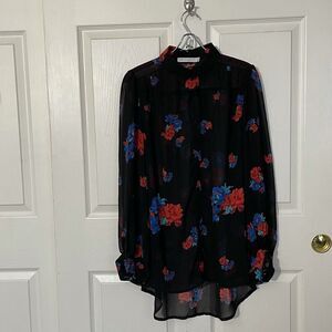 MINKPINK Sheer Black Button Down Flowey Blouse with Vibrant Red & Blue Roses. Absolutely stunning top to dress up on wear casual. Balloon like sleeves with gorgeous pleating in front and back. The colors just pop on this blouse! Extra button included. Approximate measurements are 27 length (front), 32 length (back) and 20 armpit to armpit. Size Medium. EUC