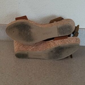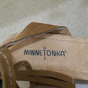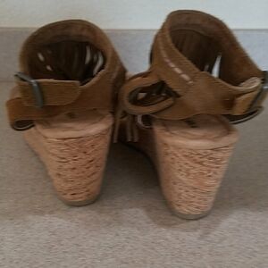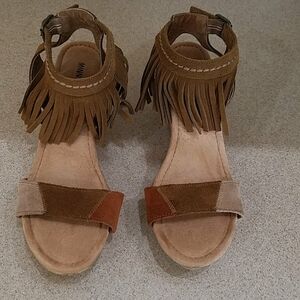 Brown Suede 2-3/4" wedged heels from Minnetonka (sz 8). The shoes have fringed ankle straps. They are in great condition. The wedged heel is cork.
