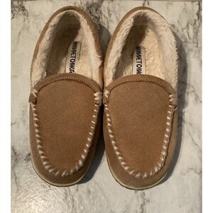 MINNETONKA Moccasins Women Slipper Sz 7 Tan Leather Sherling Fur Lined Hard Sole