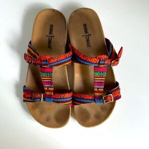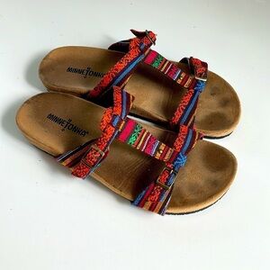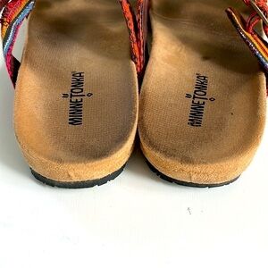 minnetonka womens sandals raz size 7 rainbow leather slides boho festival fashion woven summer shoes slip on comfortable casual footwear artisanal handmade hippie chic y2k retro indie style unique colorful vibrant lightweight durable cushioned sole everyday wear outdoor travel vacation beach pool party outfit vintage inspired trendy stylish fun practical versatile wardrobe staple gift idea timeless brand quality classic comfort outdoor lifestyle summer vibes concert outfit