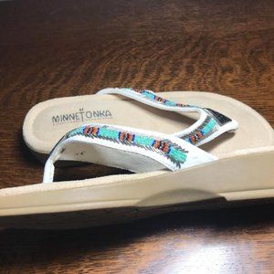 MINNETONKA SANDAL, WHITE LEATHER BEADED, SIZE 5